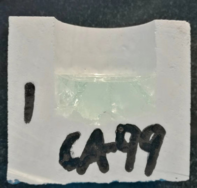 我们采用的是坩埚法,将烧结好的产品切成80cm3方块,钻直径43mm,深45mm的孔,里面放入65g碎白玻璃料,碎玻璃成分如下: